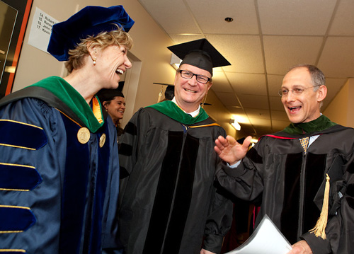 UCSF Chancellor Sue Desmond-Hellmann laughs with Sam Hawgood, dean of the UCSF School of Medicine, and Ezekiel Emanuel, the head of the Department of Bioethics at the National Institutes of Health, who was the commencement speaker at the medical school graduation.