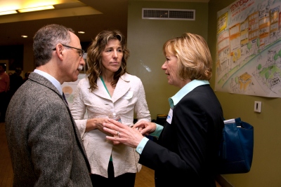 UCSF Chancellor Susan Desmond-Hellmann, right, talks with Kevin Grumbach and Laura Schmidt, who both co-direct the Community Engagement and Health Policy program of UCSF's Clinical and Translational Science Institute.