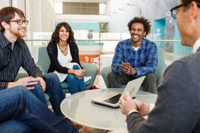 Graduate students and ‘Carry the One Radio’ founders say UCSF, with its culture of independence, set the tone for creating the show. From left: Bryan Seybold, Karuna Meda, and Osama Ahmed interview faculty member Eric Collisson.