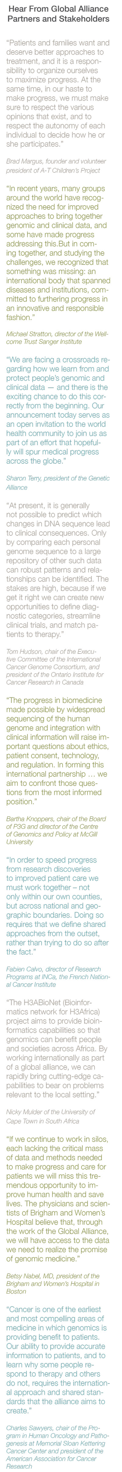 “The ability to collect and analyze large amounts of genomic and clinical data presents a tremendous opportunity to learn about the underlying causes of cancer, inherited and infectious diseases, and responses to drugs,” said David Altshuler, deputy director of the Broad Institute of Harvard and MIT, who is spearheading the Global Alliance. “However, we will only realize this opportunity if we can establish effective and ethically responsible approaches to share data. We believe that by working together and by committing to the principle that each individual has the right to decide whether and how broadly to share their personal health information, we can accelerate progress in life sciences and medicine.”