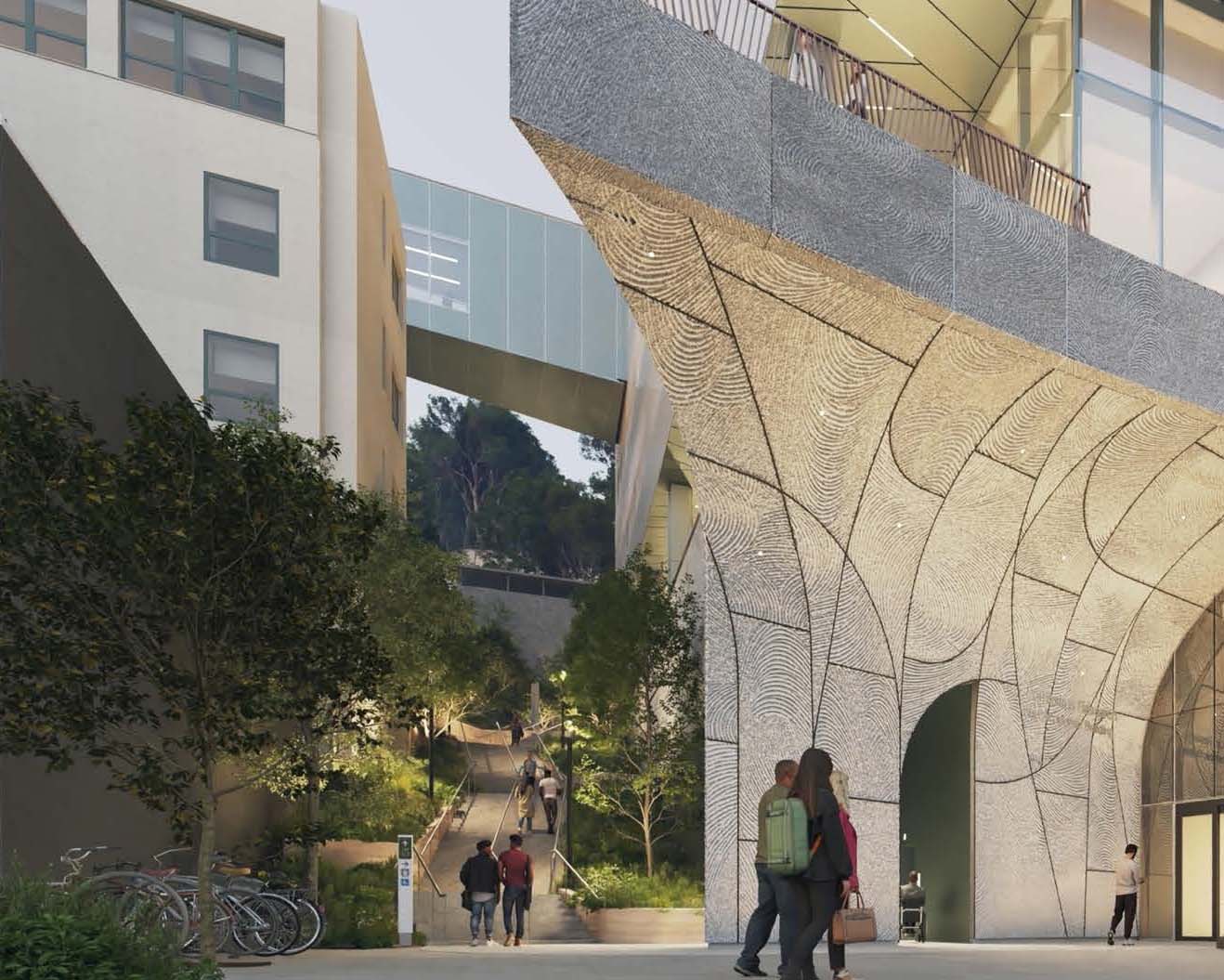 Thoughtful campus-community integration begins with an inviting entrance on Parnassus Avenue and extends to outdoor gathering areas, a grand staircase and adjacent elevator for hillside access, and a sheltered overlook to enjoy the striking westward views.