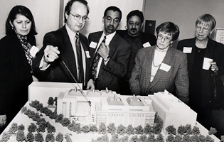 Bruce Spaulding, vice chancellor for University Advancement and Planning, points to features of UCSF's first research building at Mission Bay at a meeting of the Community Advisory Group. Pictured from left, are Gloria Bonilla, Steve Arcelona, Phil DeAndrade, a resident of Mission Creek, Sue Bierman, then a member of the San Francisco Board of Supervisors, and Elaine Johnson.