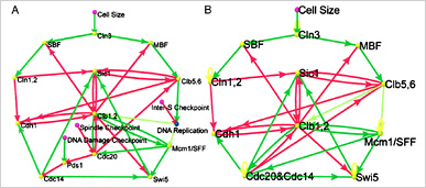 (A) The cell-cycle network of the budding yeast. (B) Simplified cell-cycle network with only one checkpoint "cell size." (See larger)