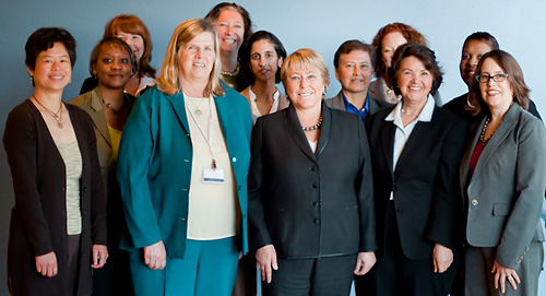 Pictured at UCSF Mission Bay on May 5 are, from left, in the front row, faculty members Ida Sim, Vice Provost Sally Marshall, President Michelle Bachelet, Beatriz Manz, Elena Fuentes-Afflick; middle row, Sharon Youmans, Tejal Desai, Alma Martinez, Cherrie Boyer and back row, Susan Kools, Elizabeth Ozer and Judith Moskowitz.