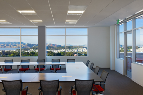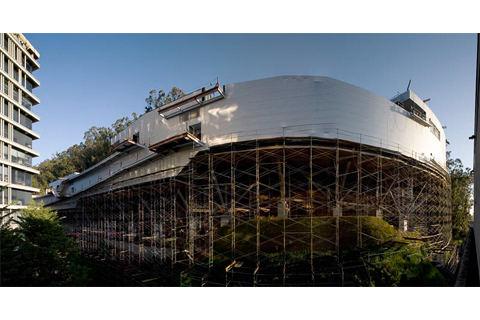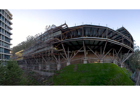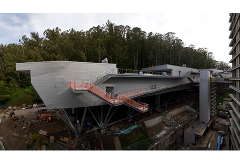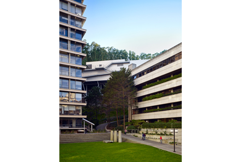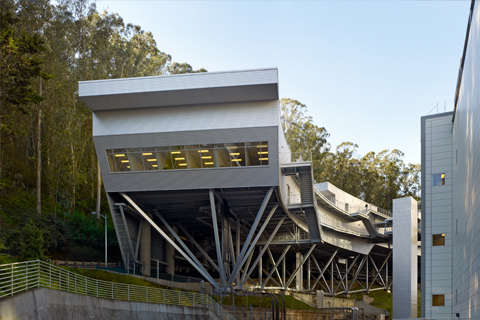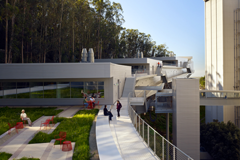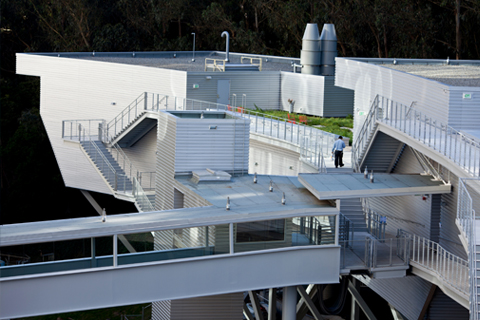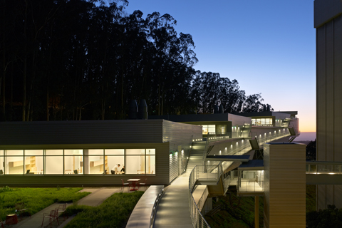 Designed by renowned architect Raphael Viñoly, in collaboration with the design/build team of DPR Construction, SmithGroup Architects and Forell/Elsesser Engineers, the cantilevered, serpentine building is a series of four split-level floors with terraced roofs with grass-covered patios. Open labs flow into each other, with office and lounge areas located on the routes between labs, promoting interaction throughout the building.