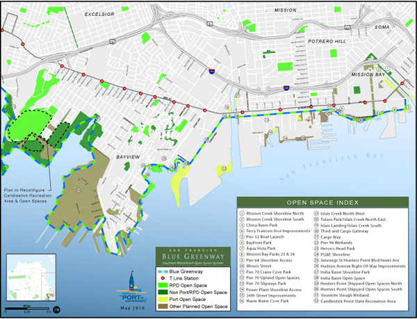 The Blue Greenway is the City of San Francisco's effort to improve the City's Southern portion of the 500-mile, nine-county regional Bay Trail and the Bay Water Trail and associated waterfront open space system. The 13 miles of waterfront parks and trails are planned to run from the Giants’ AT& T Park to Candlestick Point, connecting the Bayview-Hunters Point development with direct access to downtown San Francisco.