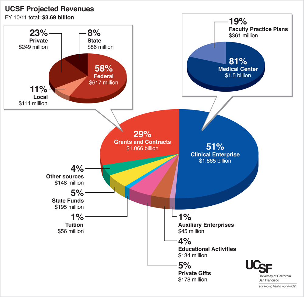 UCSF factored our share of the first $500 million reduction – approximately $28 million – into our 2011-2012 budget planning, plus an additional $18 million that will affect certain of our local programs over the next several years. While the reduction in funding from the state was significant, UCSF this year also faced a $120 million increase in fixed-cost increases across the entire enterprise. These increases included the cost of employees’ health care benefits and the campus’ share of contributions to the employee retirement plan, as well as faculty merit increases.