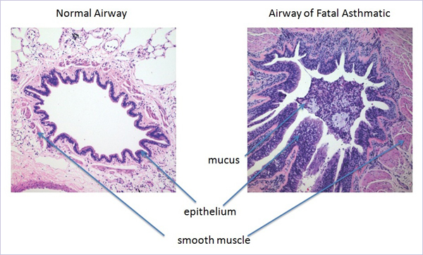 Normally humans have few mucus-producing cells but asthma sufferers have an elevated number of these cells in the lining of the tubes that lead to the lungs. Asthmatics also have an abnormal amount of smooth muscle surrounding the airway tubes. Even the slightest stimulus can cause these to contract.