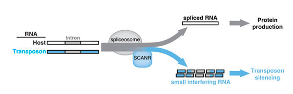 In the current study, the researchers discovered that the cell’s splicing machinery stalls when it gets to transposon introns. SCANR recognizes this glitch and prevents transposon replication by triggering the production of “small interfering RNA” molecules, which neutralize the transposon RNA. The earlier discovery by biologists Andrew Fire and Craig Mello of the phenomenon of RNA interference, a feature of this newly identified transposon targeting, also led to a Nobel Prize.