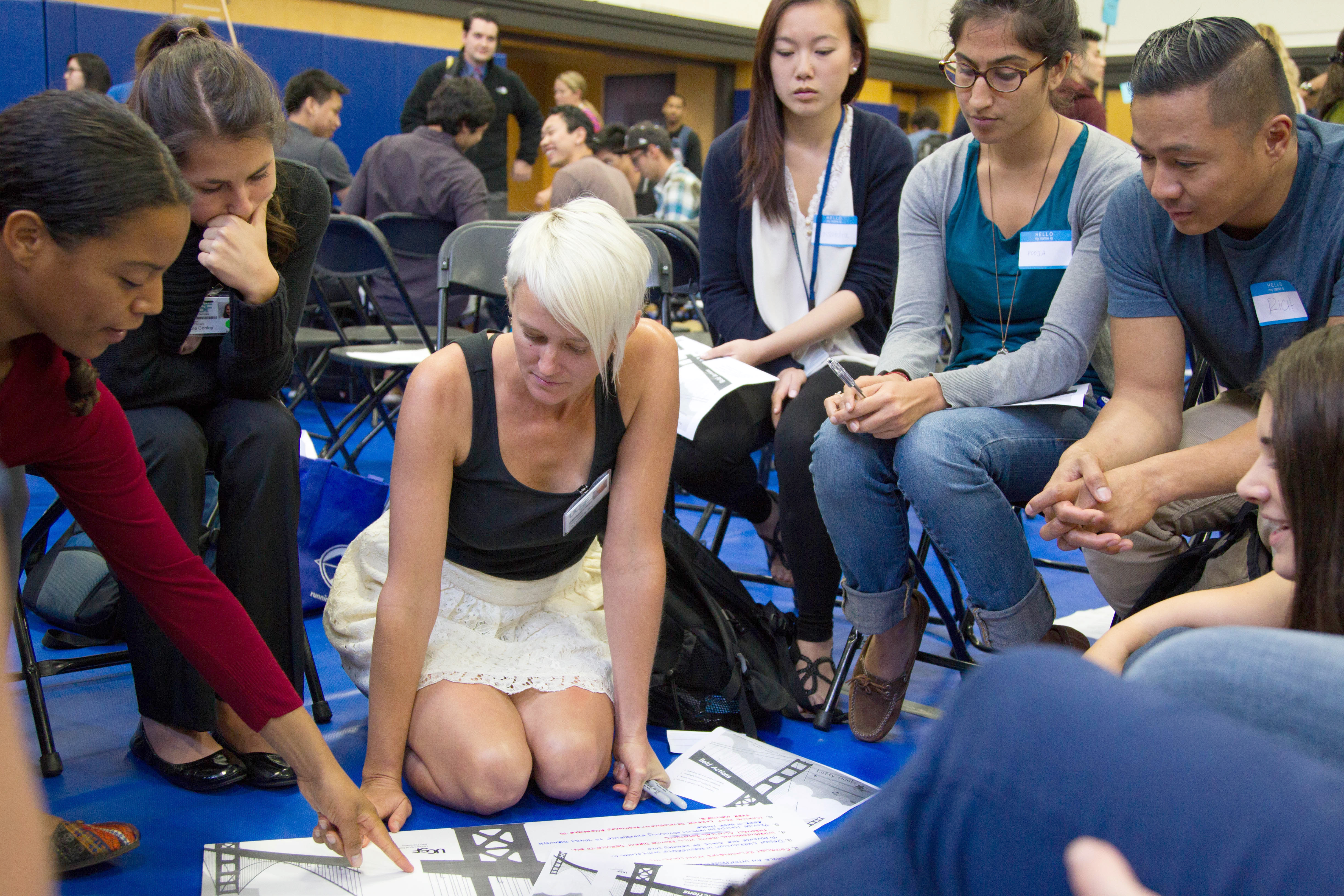 After her talk, the students split into small groups of 10 to 12 people, each group named for a state (hence the signs around the gym). Each group included people studying in at least four different disciplines, and each was tasked with coming up with a proposal for a new initiative at UCSF. They were encouraged to think big; teams of faculty will evaluate the proposals, and the winning team will have an opportunity to pitch its idea to campus leadership, with the chance of receiving funding.