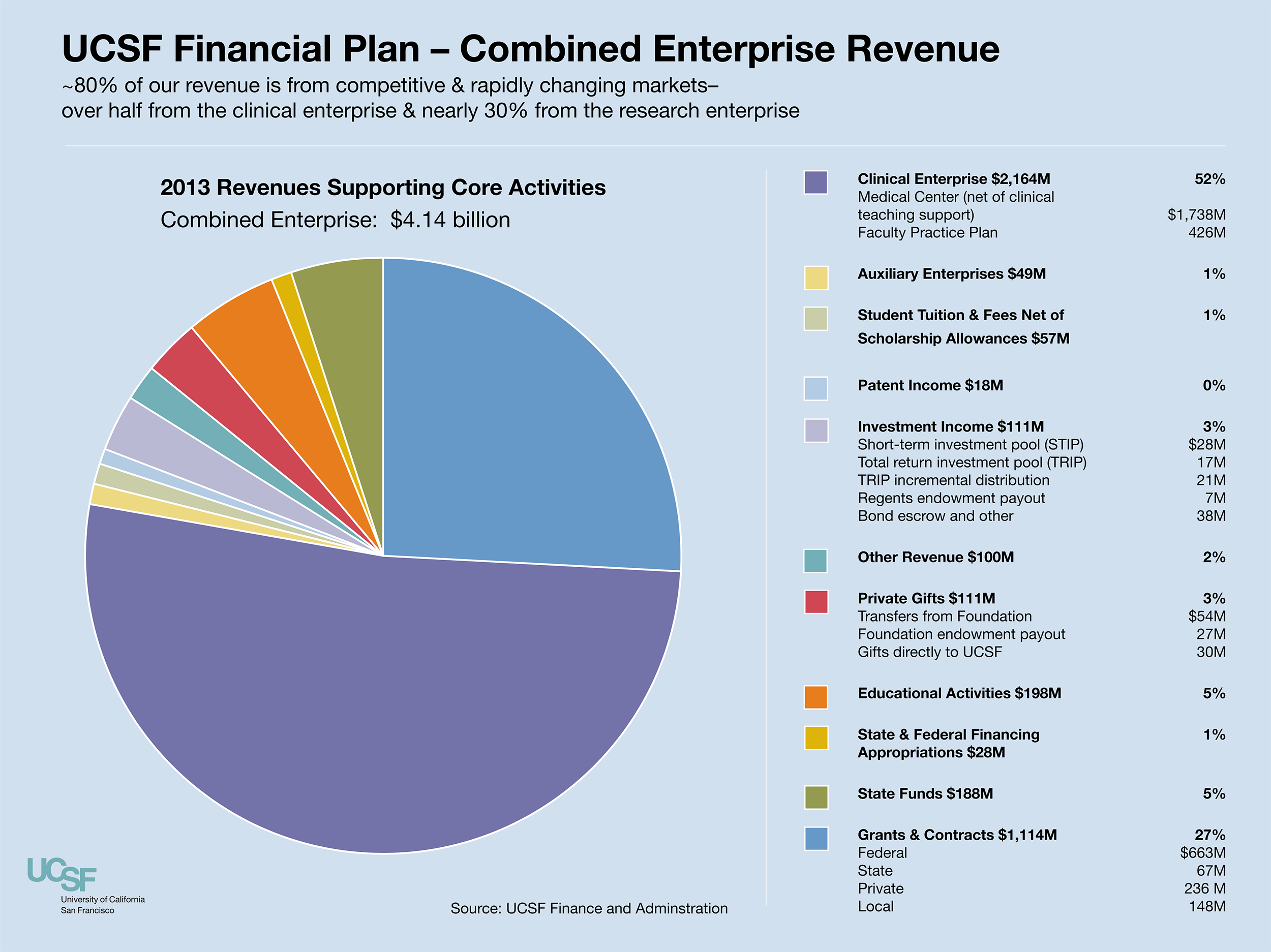 About 80 percent of UCSF’s $4.14 billion revenue for 2012-2013 comes from or is dependent upon competitive and rapidly changing markets. The financial health of the clinical enterprise (which includes UCSF Medical Center, UCSF Benioff Children’s Hospital, Langley Porter Psychiatric Institute and outpatient clinics) is extremely important to all of UCSF as it accounts for more than half of all revenues, or $2.164 billion, which includes millions that are invested across the campus every year.