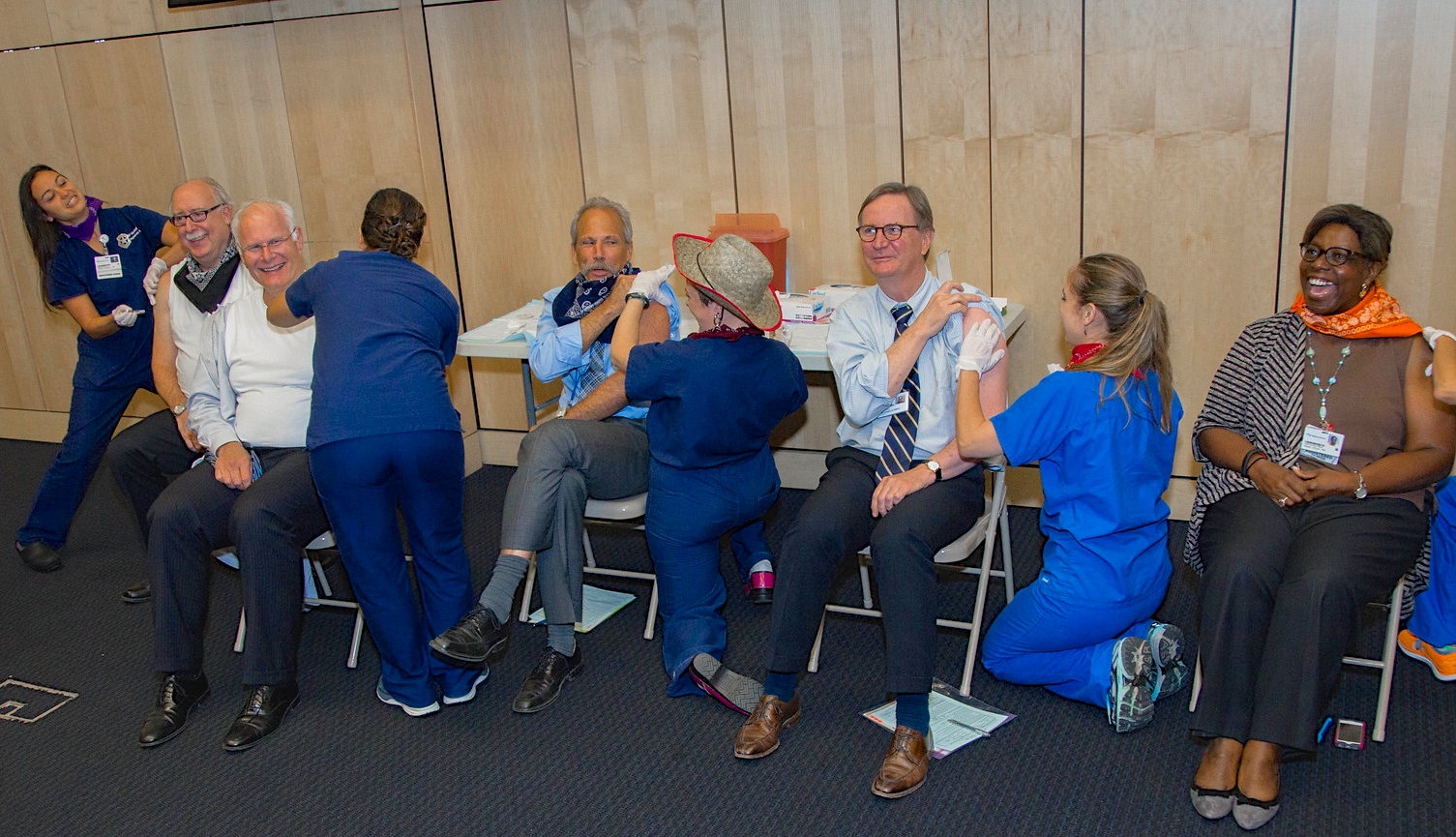 UCSF Chancellor Sam Hawgood, MBBS; UCSF Medical Center CEO Mark Laret; UCSF Medical Center Chief Nursing Officer Sheila Antrum, RN, MSHA; School of Nursing Dean David Vlahov, RN, PhD; and School of Pharmacy Dean B. Joseph Guglielmo, PharmD, were among the first to get vaccinated at a cowboy-themed “Flu Shot Roundup” event held Oct. 2 at Cole Hall, where many donned Western bandanas.
