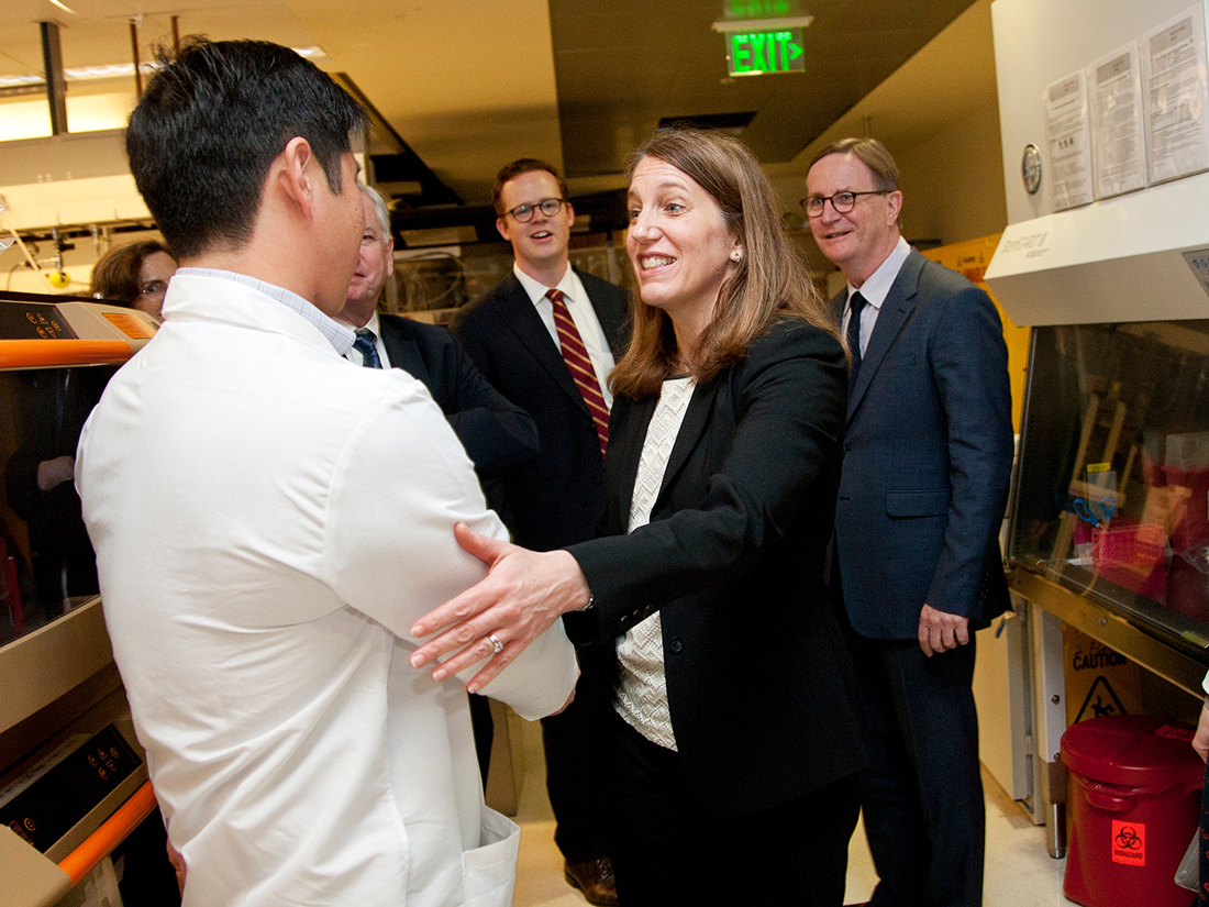 Burwell visited UCSF's Center for Advanced Technology to talk with UCSF scientists who are working to gather genetic and other data from patients with specific diseases in an effort to develop targeted therapies.