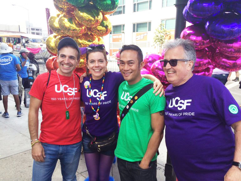 Marcel Alavi and his fellow founding members of the UCSF Pride Committee (pictured: Marcel Alavi, Solange Madriz, Larry Lariosa, and Robert Mansfield) worked together with the UCSF LGBT Resource Center to create a visible presence for the gay, lesbian, bisexual, & transgender (LGBT) campus and medical center community by marching in the 2015 SF Pride Celebration.