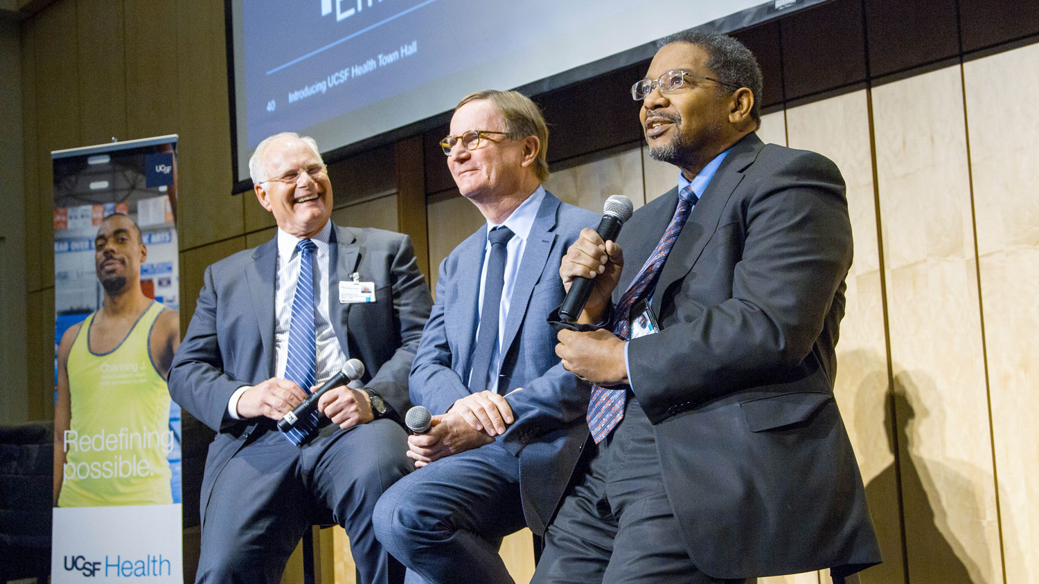 At a town hall meeting on Nov. 16, UCSF Chancellor Sam Hawgood, MBBS, who is also chair of UCSF Health; Mark Laret, president and CEO of UCSF Health, and Talmadge King, MD, dean of the School of Medicine and vice chancellor for medical affairs, described the goals of this new health system.