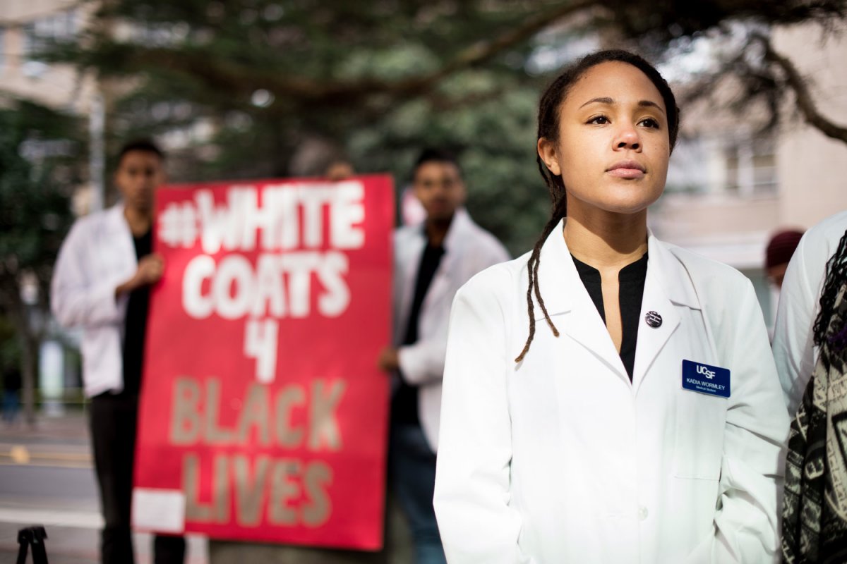 ACTIONS SPEAK LOUDER: UCSF medical students who launched the national “White Coats for Black Lives” movement last year were recognized with a "Hero Award" by the San Francisco Human Rights Commission in August. Their work didn't end there: Students held another demonstration on Dec. 10 to push for changes to increase diversity at UCSF and address quality and access disparities in health care. Photo by Noah Berger