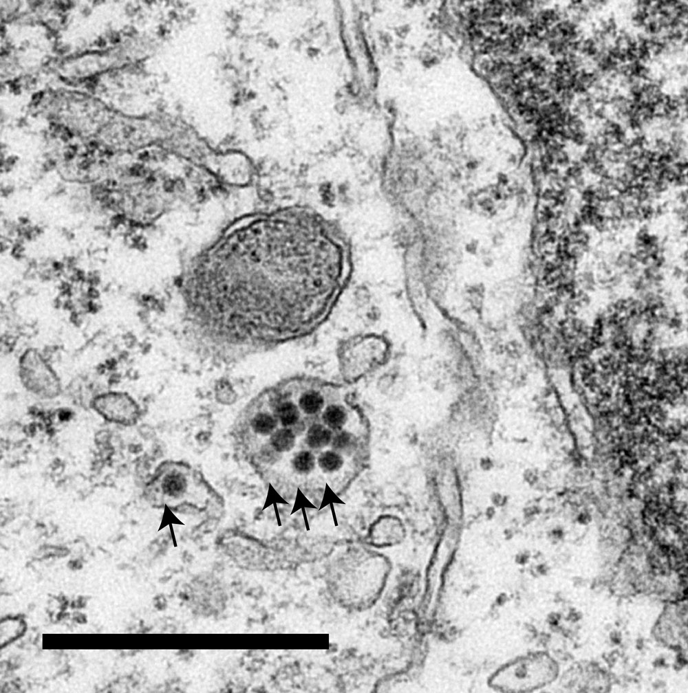 Fluorescent staining of Zika virus (shown in green) infecting neural cells. The nuclei of the cells are stained in blue. The scale bar is 10 μm. Image by Claudia Sanchez/Chiu labElectron micrograph of the inside portion of a Zika-infected neural cell, showing uptake of Zika virus particles (indicated by black arrows) in membranous vesicles. The scale bar is 0.5 μm. Image by Claudia Sanchez/Chiu labPrompt diagnosis of chikungunya and dengue also remains important, Chiu said, as these infections can also lead to longer-lasting medical problems in some cases. Chikungunya infection can cause chronic arthritis, while infection with the dengue virus can cause encephalitis, immune-mediated syndromes and stroke.