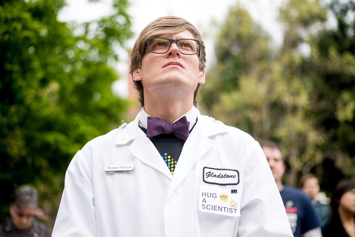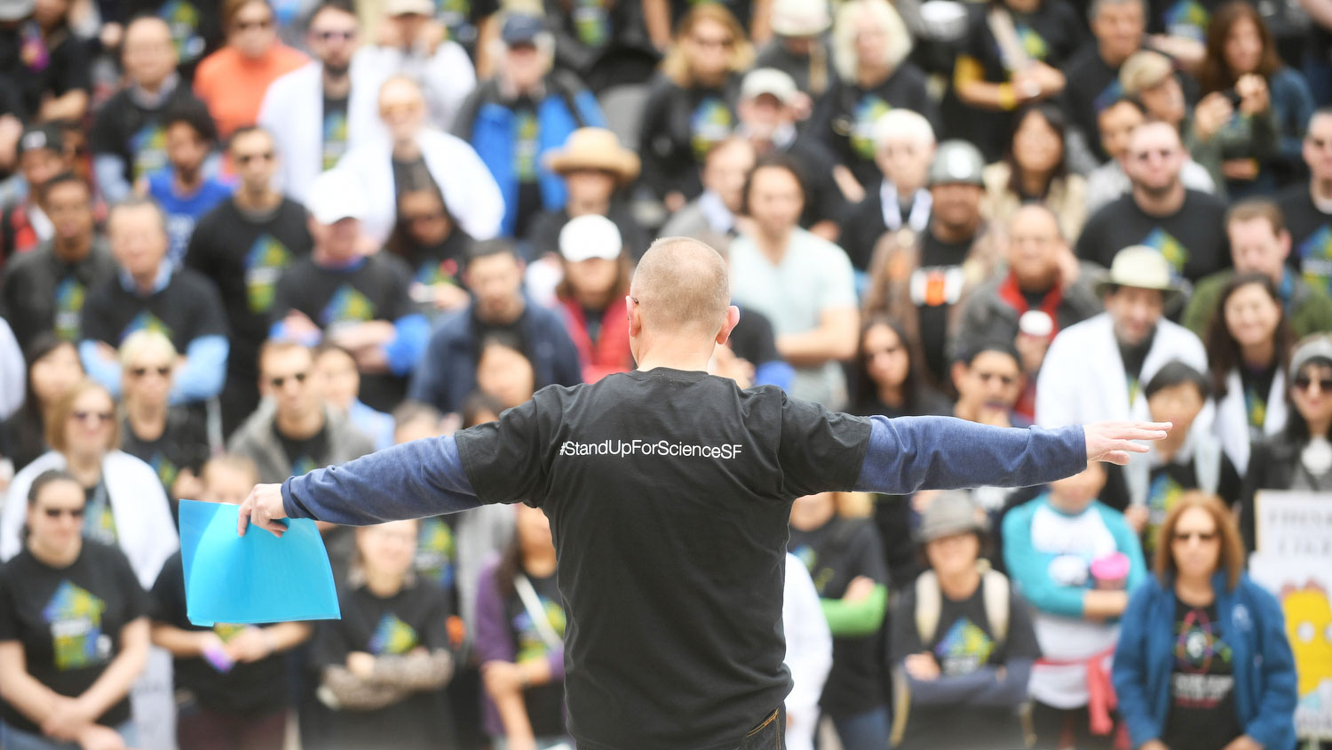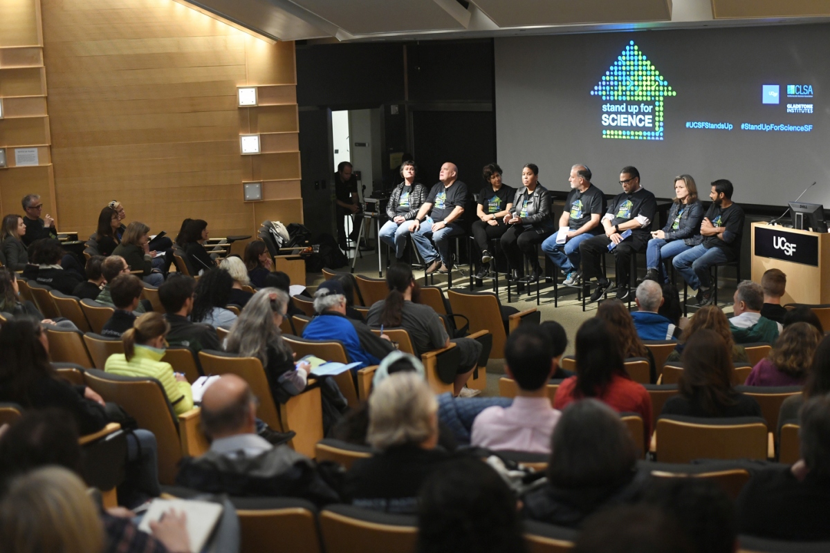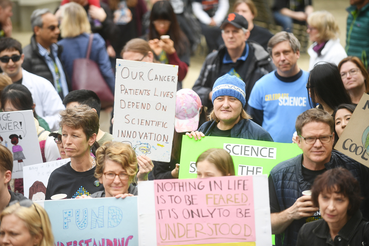 The teach-in was followed by a rally outside Genentech Hall organized jointly by UCSF, the California Life Sciences Association and the UCSF-affiliated Gladstone Institutes. Leaders from the Bay Area life sciences community spoke out for the need for robust funding of research and the importance of diversity and inclusion in advancing scientific discovery.