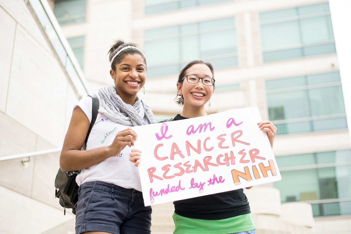The speakers were cheered on by a crowd that included students, scientists and physicians – many wearing their white coats – their families, and members of the community. They waved colorful signs celebrating science and sported “Hug a Scientist” pins.