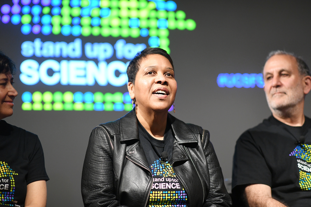 Hana El-Samad, PhD, associate professor of biochemistry and biophysics, called on every person in attendance to become a “broadcasting station for science.” She quoted President John F. Kennedy, saying, “Ignorance in one citizen in a democracy impairs the safety of all.”