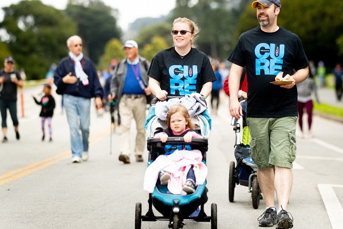 Kristin Harter, PharmD, assistant clinical professor in the UCSF School of Pharmacy, walks in the AIDS Walk San Francisco event with her 2-year-old daughter and Kyle Jones, DDS, PhD, assistant clinical professor in the School of Dentistry. Photo by Noah Berger