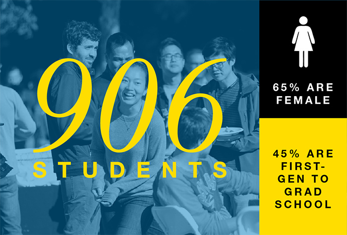 Sixty-two percent of new students are California residents, and about 49 percent were born in California. Twenty-seven percent are the first generation in their families to graduate college; 45 percent are the first generation in their families to attend graduate school.