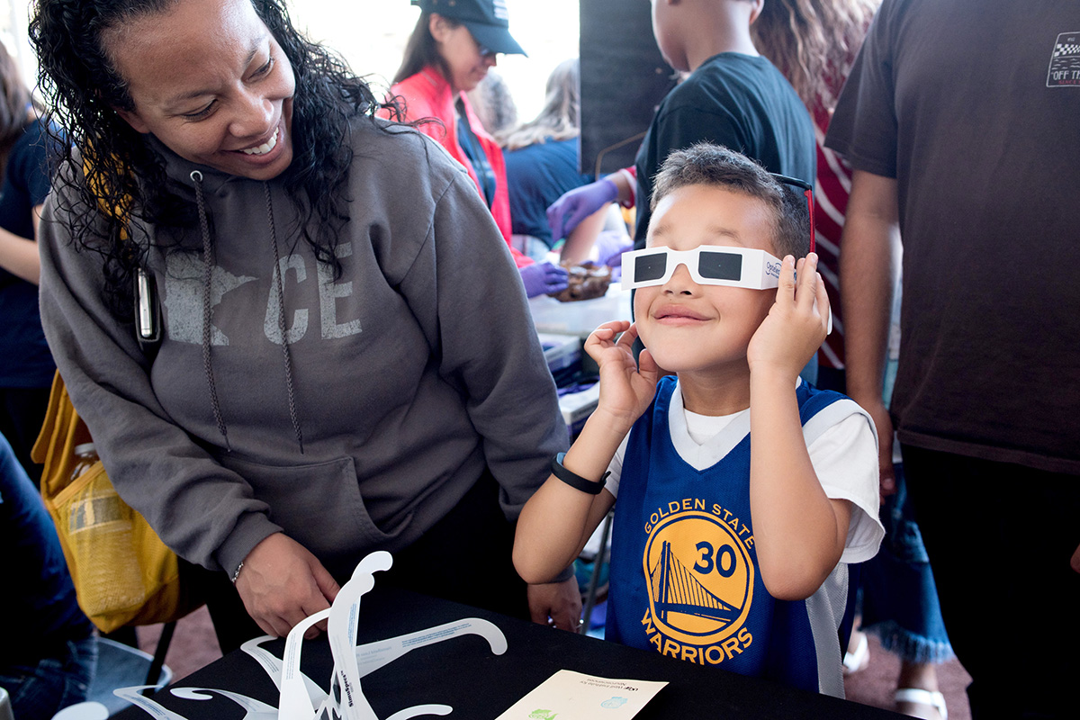 Karen Bell (left) watches her son Isiah Hill, 6, experiment with 3D glasses at the Neurobiology booth at the Bay Area Science Festival Discovery Day 2018. Photo by Barbara Ries