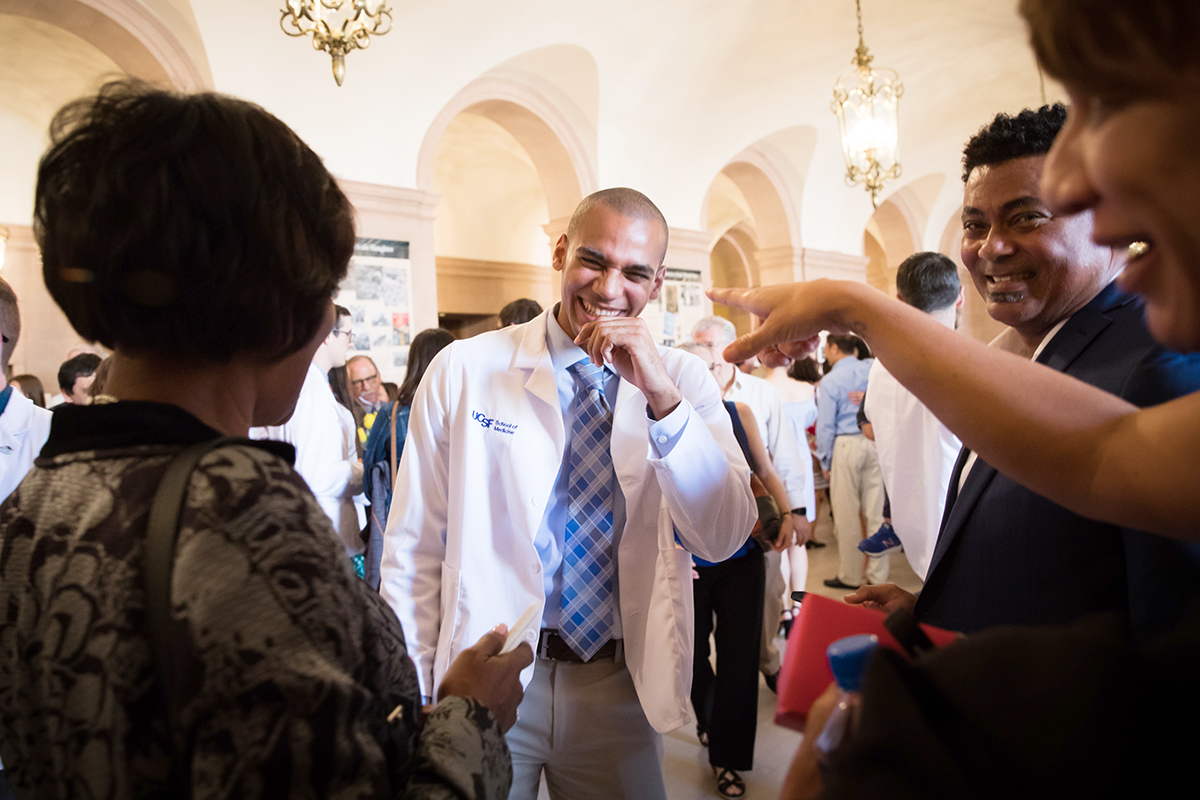Chace Shaw laughs with family members after UC San Francisco’s School of Medicine white coat ceremony, which was held Aug. 10 at Herbst Theatre in San Francisco. The ceremony marked the 149 new students’ rite of passage into the medical profession. Photo by Elisabeth Fall