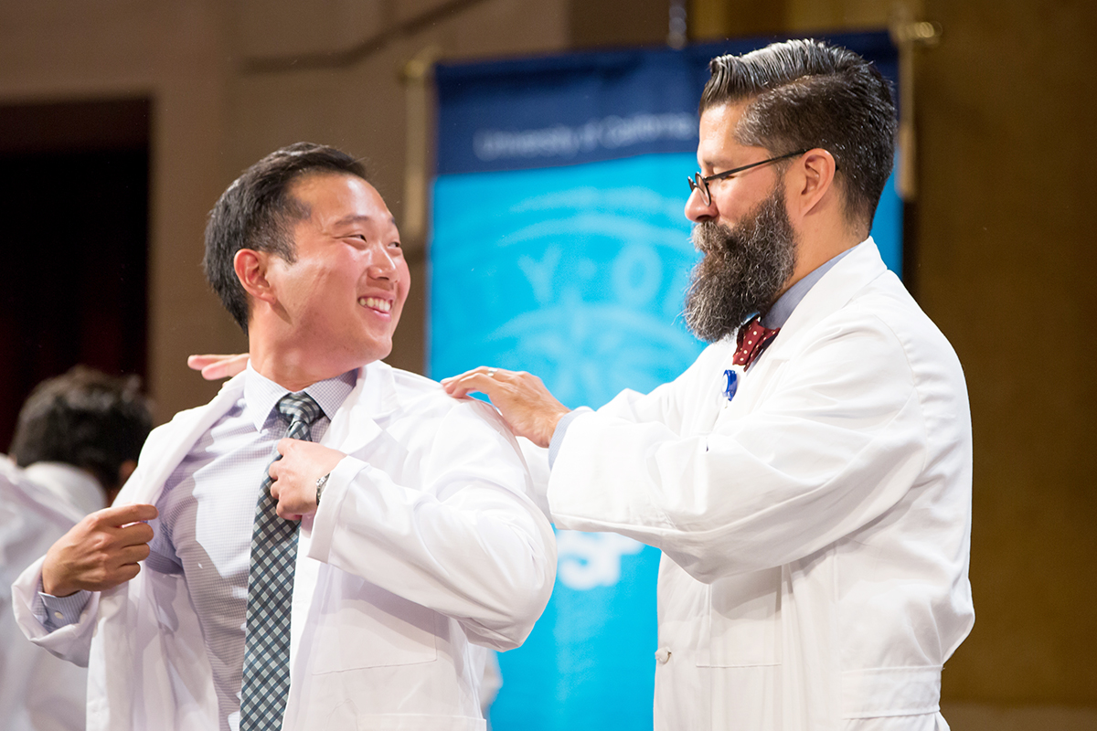 Silvia Park, an incoming student in the three-year joint PT program with UCSF and San Francisco State University, receives her first white coat from Kenneth Leung, DPT, assistant clinical professor of Physical Therapy, with an energetic send-off, at a ceremony in Cole Hall, at the Parnassus campus. Photo by Susan Merrell