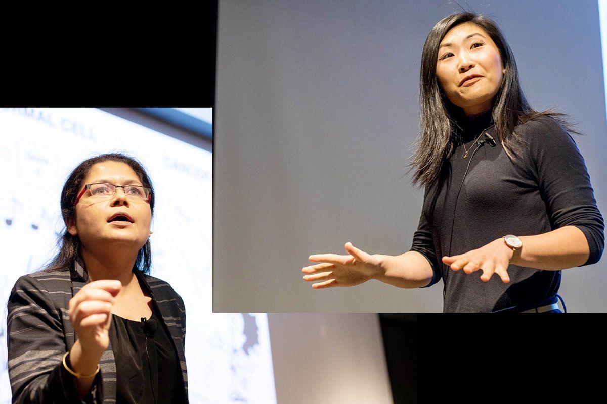 SCIENCE SLAM DUNKS: Bioengineering graduate student Yiqi Cao and postdoc Sona Chowdhury, PhD, won this year’s competitions aimed at promoting science communication. Cao impressed judges and the audience to win the Grad Slam competition with her talk about designing safer stents. She went on to also place second in the UC-wide competition. Chowdhury, PhD, won the Postdoc Slam for her straight-talk on anal cancer. Photos by Susan Merrell