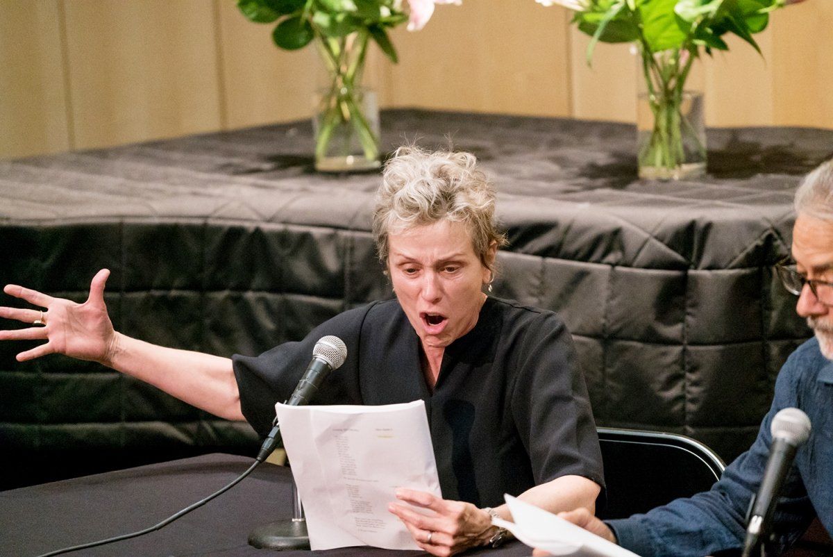A DIALOGUE ON DEATH: Two-time Oscar winner Frances McDormand headlined a star-studded night at UCSF’s Cole Hall, in a performed reading of “Sudden Death by Illness, Injury, or Choice: Modern Tragedies, Ancient Verse” in April. The programs by the Theater of War Productions use ancient Greek plays to drive discussion about difficult subjects, such as sudden death. Photo by Barbara Ries