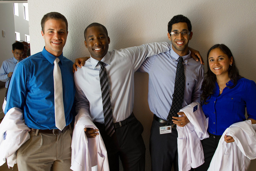 Medical students from the Class of 2017 pose before their Aug. 30 White Coat ceremony at Robertson Auditorium on the Mission Bay campus. From left: Tom Gather, Donald Goens, Walid Hamud and Lauren Hennein. Photo by Susan Merrell