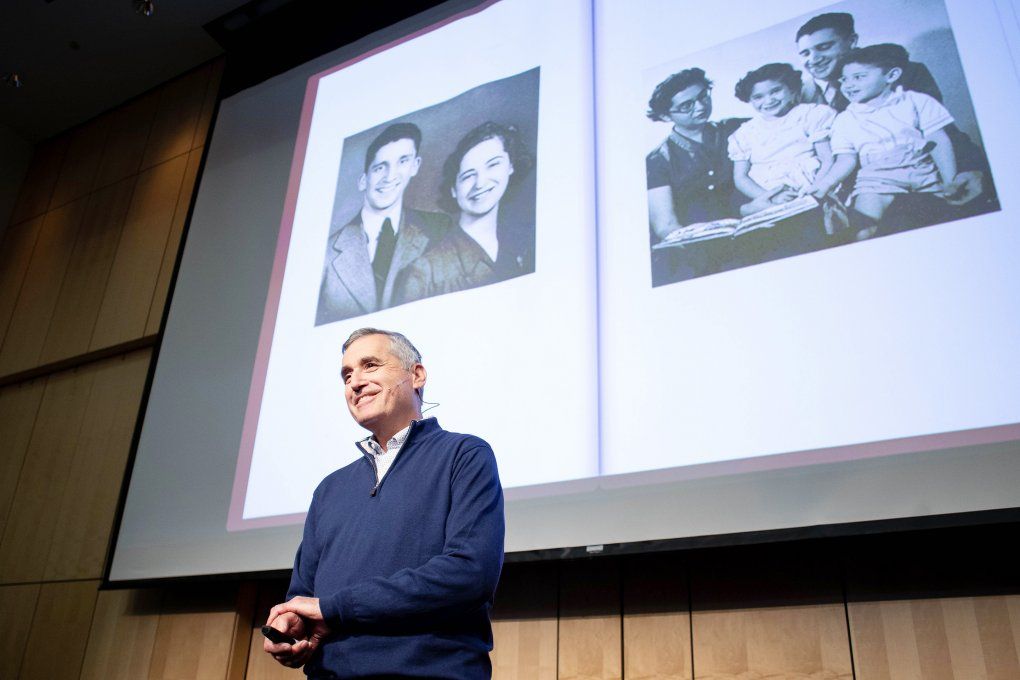 David Wofsy, MD, projects pictures of his family during the 2019 Last Lecture. Photo by Susan Merrell