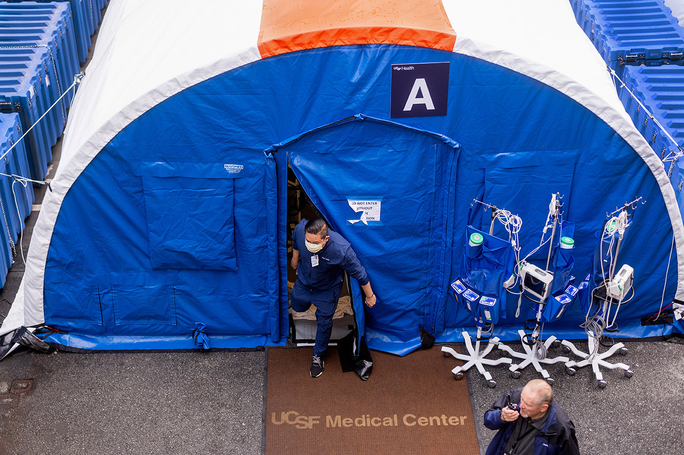 In early March, ACU’s (Accelerated Care Units) were erected to triage patients that may have been exposed to SARS-CoV-2, the virus that causes COVID-19. The units provide a negative pressure environment to house patients. Arnold Shepherd, RN, exits an ACU on March 7, 2020. Photo by Noah Berger