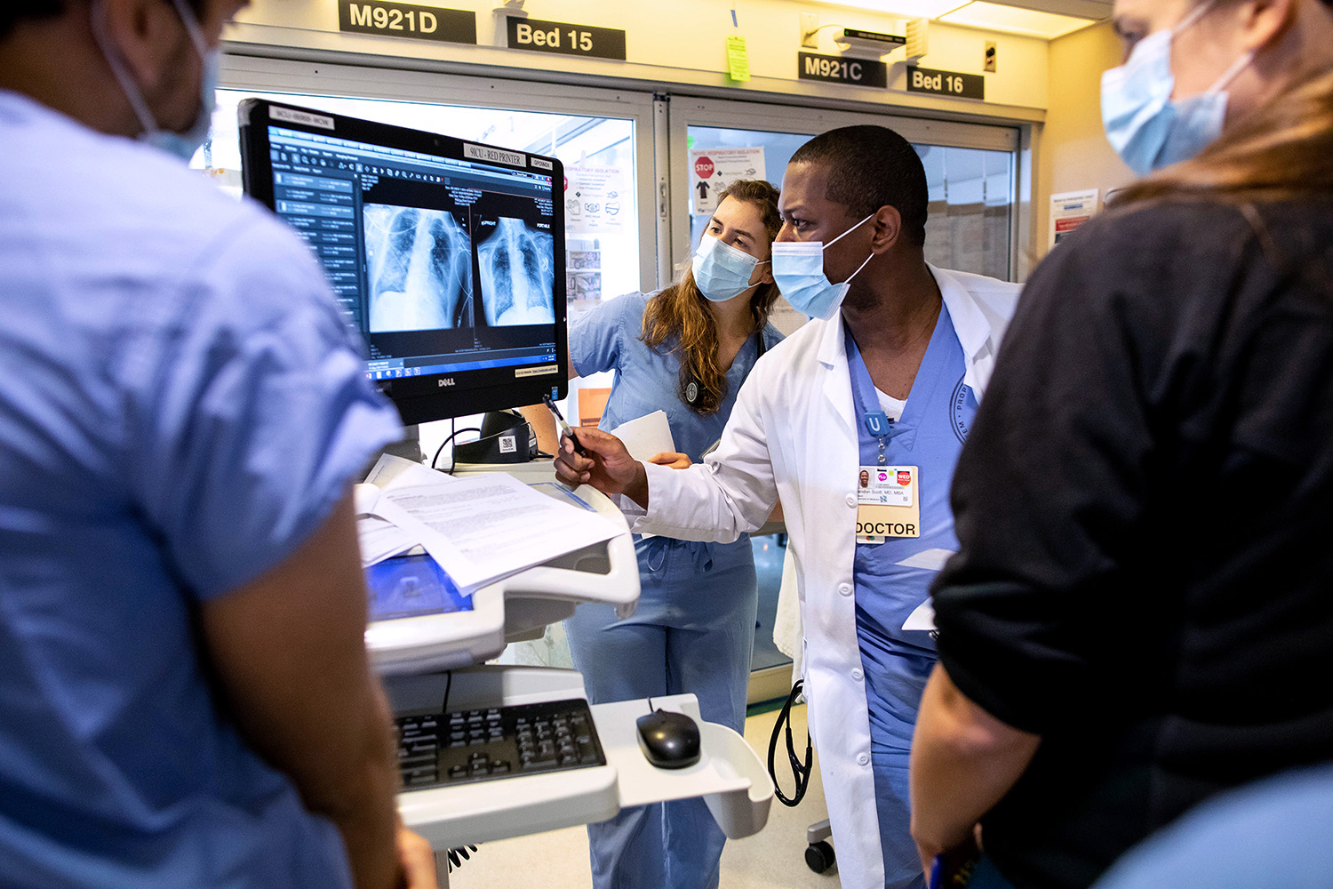 Saned Raouf (far left), MD, resident in the department of Emergency Medicine, Rachel Muster, medical student, Brandon Scott (center), MD, MBA, resident in the Department of Medicine, and Alexandra Hill (far right), MD, resident in emergency medicine, look at a lung scan during rounds in the COVID-19 Intensive Care Unit at UCSF Medical Center on the Parnassus Heights campus. Photo by Susan Merrell