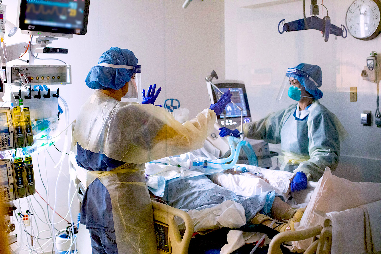 Sharon Dopak (left), RN, and Helcerna Hernandez, patient care assistant, treat a COVID-19-positive patient in a respiratory isolation room in the ICU of the UCSF Helen Diller Medical Center on the Parnassus Heights campus. Photo by Susan Merrell