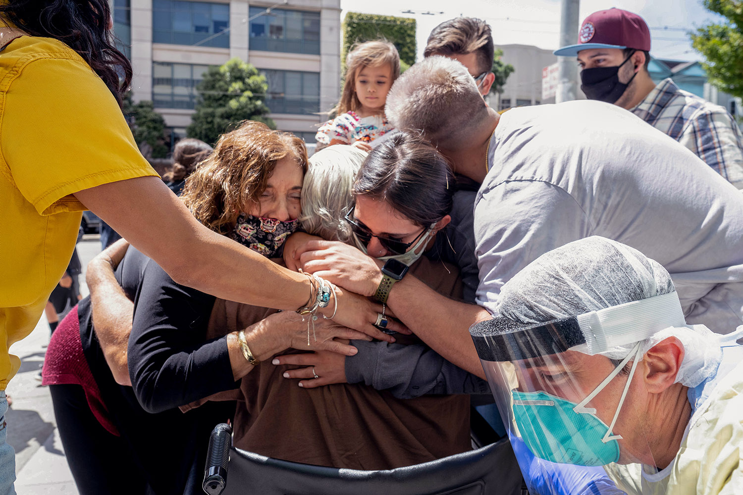 George Delgado is embraced by his family as he is released from the UCSF Mount Zion Hospital after recovering from COVID-19. Assisted by his nurse Nathan Enriquez, RN, Delgado was outside for first time in a six weeks. Photo by Susan Merrell