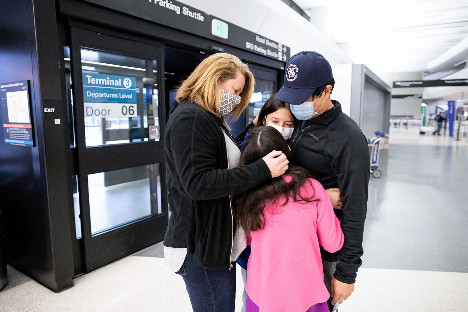 UCSF clinicians volunteered to support hospitals in greater need than San Francisco. Clement Yeh (far right), MD, a UCSF clinical professor of emergency medicine at ZSFG and medical director for the SF Fire Department, hugs his family before heading to New York-Presbyterian. His wife, Elizabeth Fair, PhD, MPH, an infectious disease epidemiologist at UCSF and daughters Elsa, 11, and Thea, 9, are there for his departure from SFO. Photo by Susan Merrell