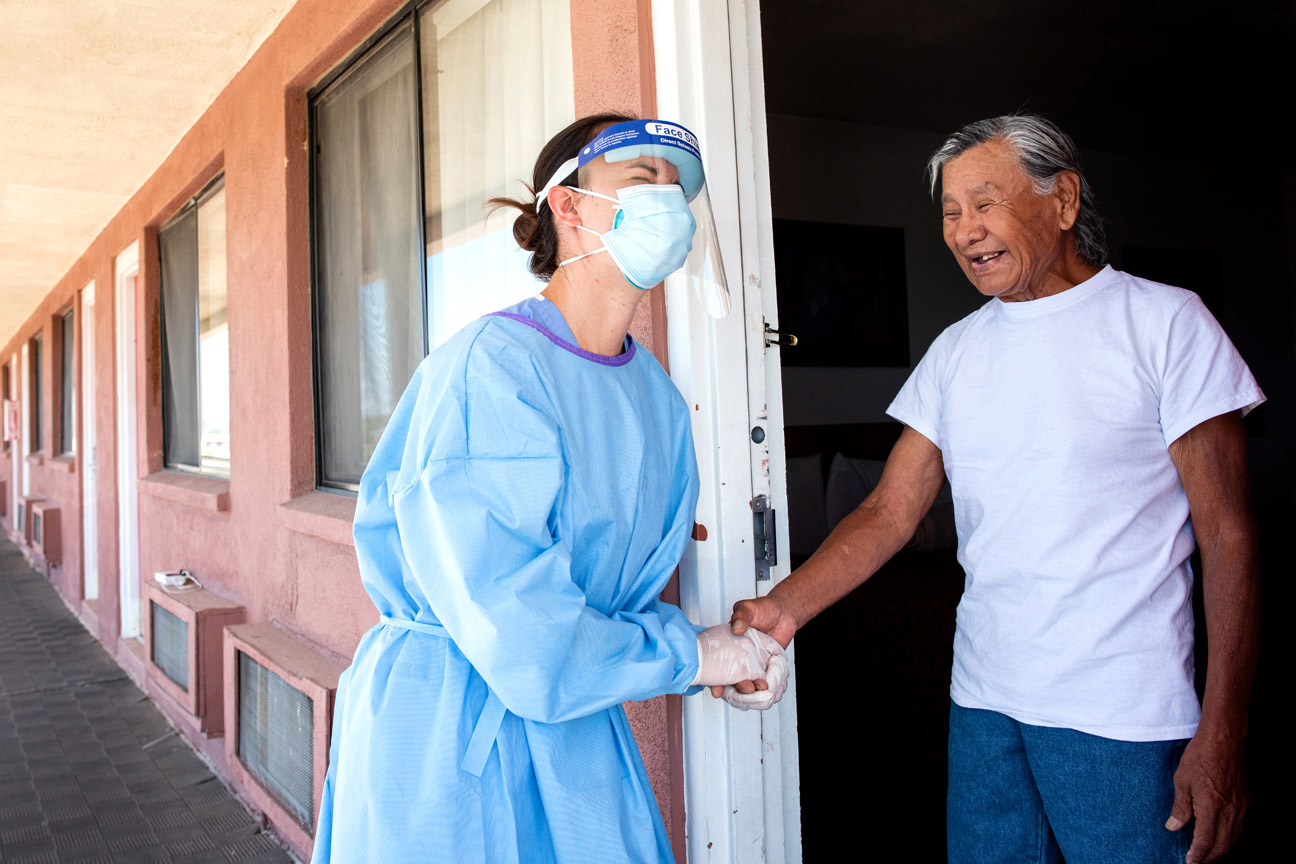 Anne Montgomery, MD, UCSF resident and HEAL volunteer in Navajo Nation, goes door to door on her rounds at the Days Inn Motel in Gallup, Ariz. She shares a laugh with Calvin Hasgood, 74, a Navajo resident in the Hotel-Motel program. Hasgood is homeless and was worried about where he will live after his COVID-19 isolation. Anne assured him the team could help place him in an elderly care residence in Gallup. Photo by Barbara Ries