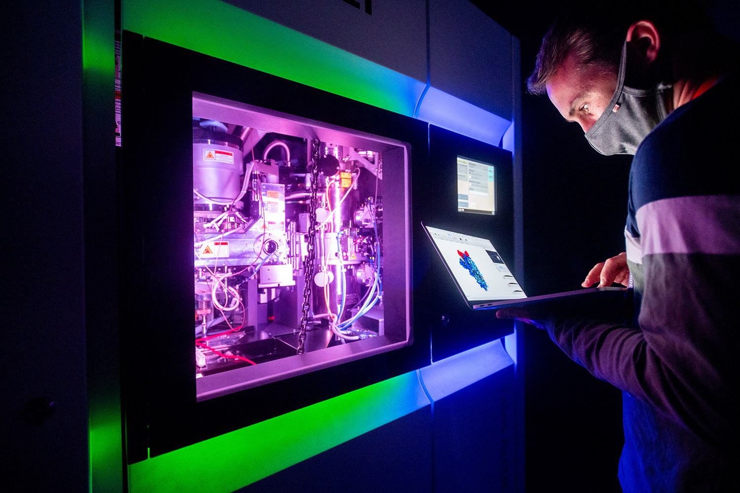 UCSF graduate student Bryan Faust examines a 3D representation of a COVID-19 spike particle, created using a cryo-electron microscope. Photo by Noah Berger