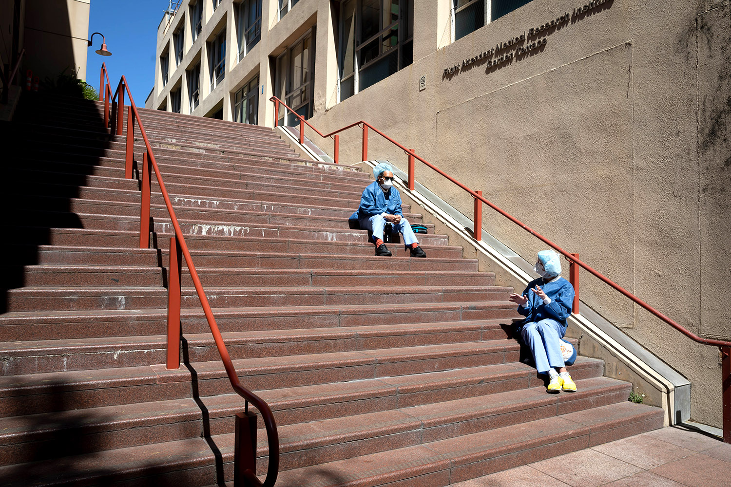 Physical distancing became part of safety precautions against transmission of COVID-19. Edgar Perez (left), principal surgical technologist, and John Briggs, surgical technician, take a physically distanced lunch break on the Parnassus Heights campus. Photo by Susan Merrell