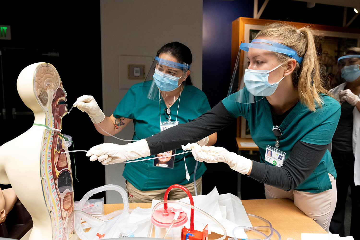 Students also needed to adapt to new procedures in their on-site learning. Claudia Martinez (left) and Rita Huober, students in the UCSF Master’s Entry Program in Nursing (MEPN), practice a tracheostomy procedure on a simulation model at the Parnassus Heights campus. Photo by Susan Merrell