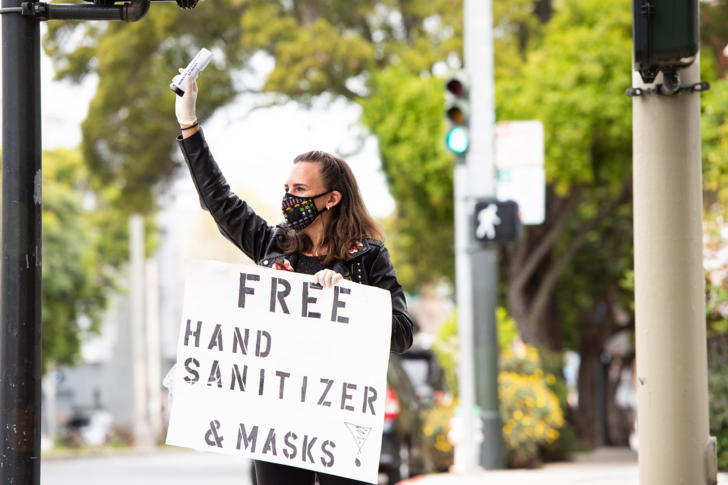 Graduate students and postdoctoral fellows in the Science Policy Group at UCSF launched a project to produce and provide sanitizer to vulnerable communities in San Francisco, people living in public or transitional housing or experiencing homelessness. Larissa Maier, PhD, postdoctoral research fellow in the UCSF Department of Psychiatry, helped with distributing free hand sanitizer and masks on Eddy Street in San Francisco. Photo by Barbara Ries