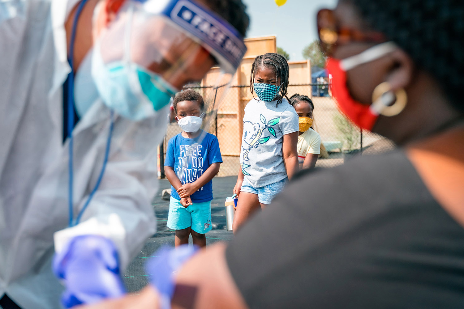 Shereda Nosakhare gets tested at the UCSF pop-up COVID-19 test site at Akoma Farmer’s Market outside of Eastmont Mall in Oakland, as her children look on. Photo by Maurice Ramirez