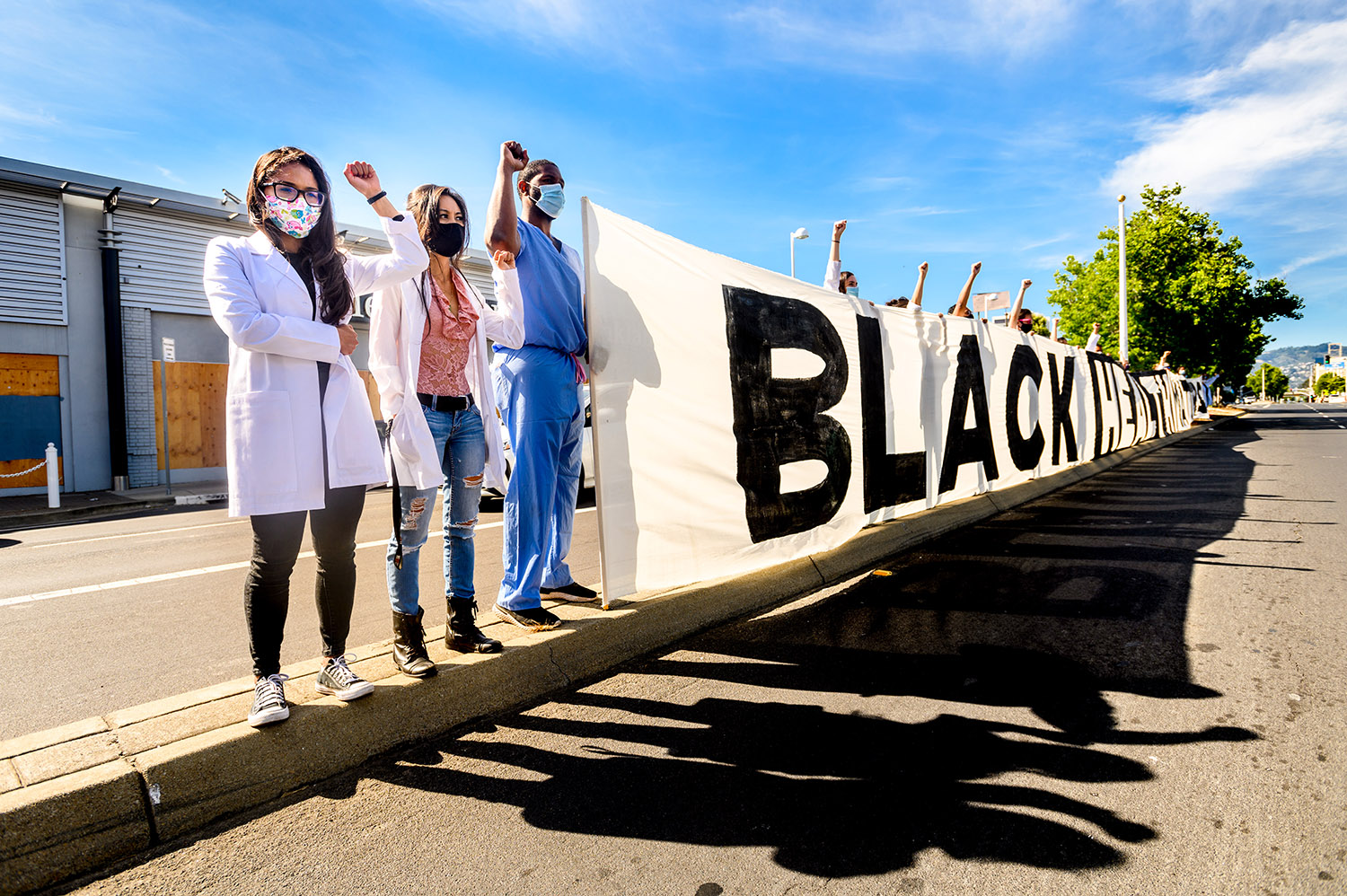 After George Floyd's killing by police, the UCSF community came out in support of the Black Lives Matter movement. UCSF nursing students Jen Chavez and Nicole Naramura and medical student Eric Smith rally against police shootings during a “Bridging the Bay for Black Lives” protest in Oakland. Photo by Noah Berger