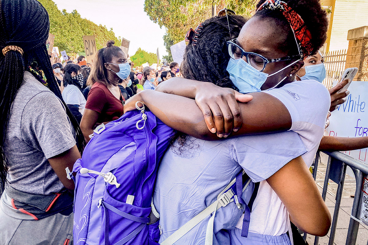In response to the killing of George Floyd, UCSF health care workers join the protest for justice as part of White Coats 4 Black Lives. Arthurine Zakama, MD, a third-year OB/GYN resident, hugs Marleen Rashad, MD, a first-year OB/GYN resident. Crowds of up to 10,000 people gathered at Dolores Park for a march from Mission High School to the district police station on Valencia Street. Photo by Barbara Ries
