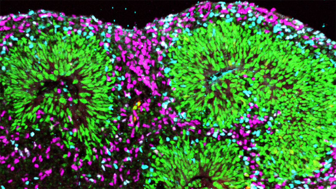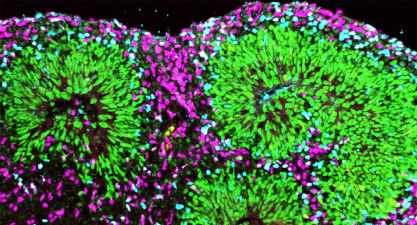 This analysis revealed that instead of differentiating normally into the brain’s distinctive cell types, organoid cells appeared to experience an identity crisis: expressing a mixed bag of genes normally found in very different kinds of cells. At first, the organoids developed structured “rosettes” of cells that resemble some features of the developing brain, but these quickly dissolved into a hodgepodge of intermingled cells. “We were able to identify the major broad categories of cell types, but the normal diversity of subtypes – which play key role in the proper function of neural circuits – was lacking,” Kriegstein said.
