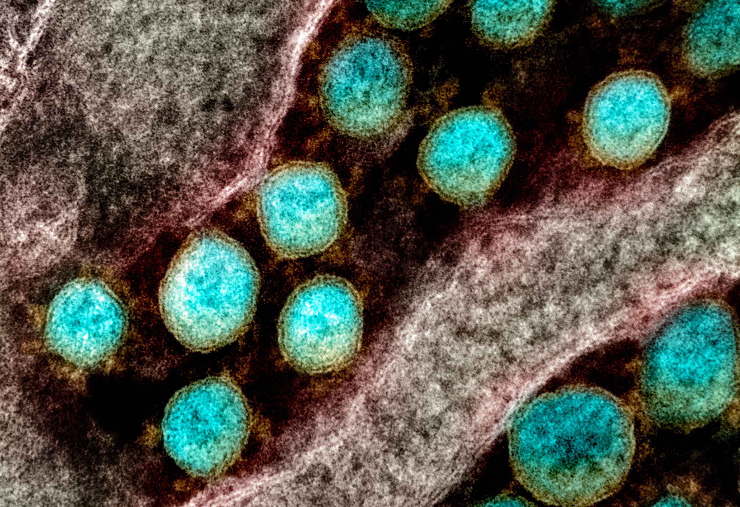 Scanning electron microscope image of the new coronavirus, SARS-CoV-2 (blue), emerging from the surface of cells cultured in the lab. Image credit: NIAID-RML