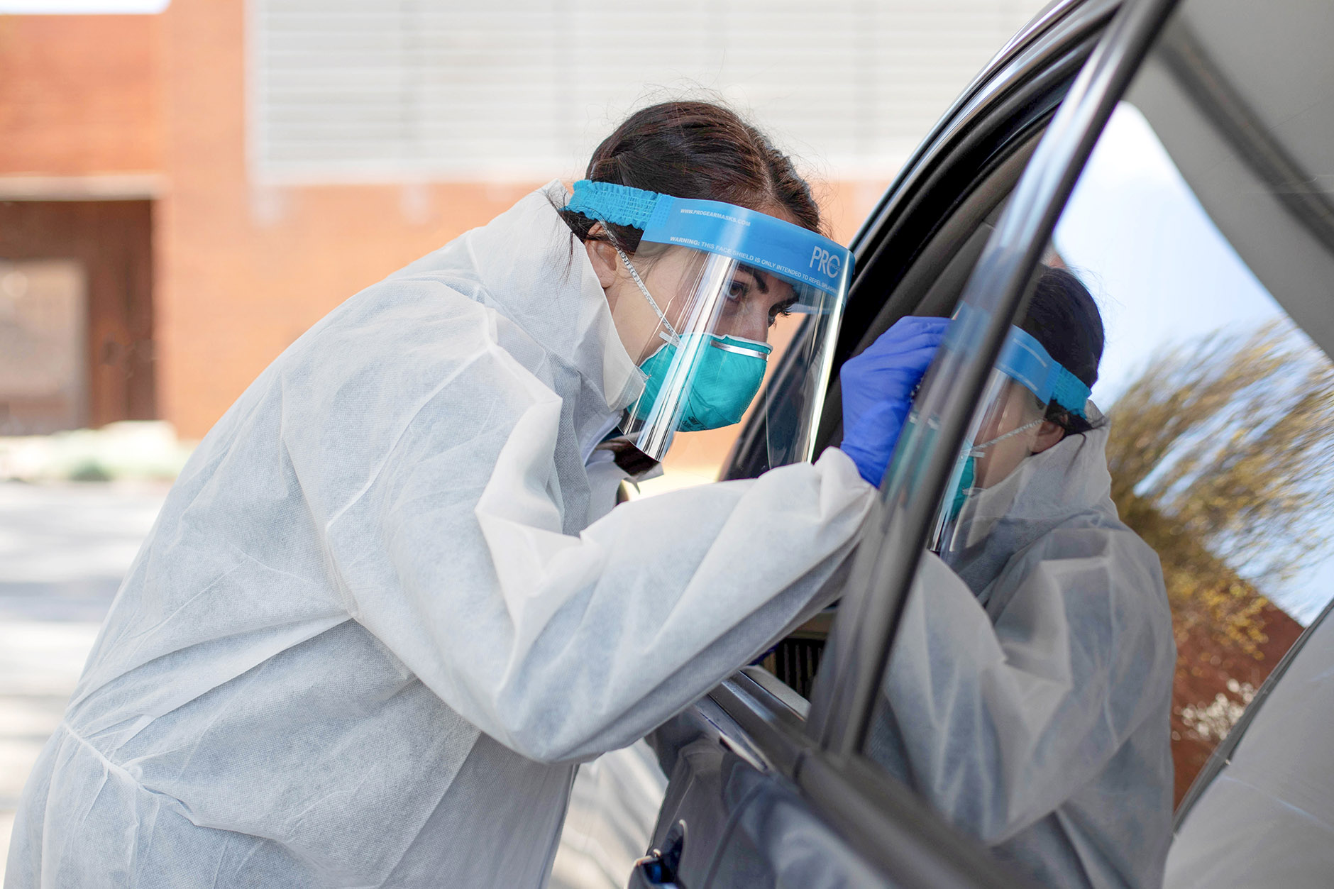 Kelly Brothers, RN, a nurse at UCSF wears an N95 mask and face shield while testing a person for COVID-19. Photo by Susan Merrell