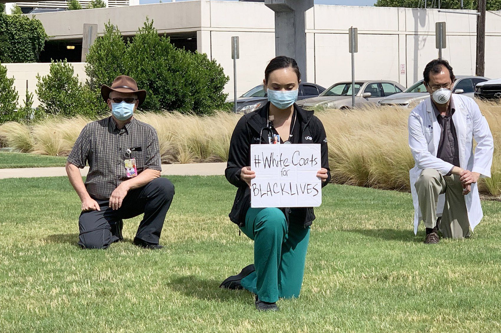Members of the UCSF Fresno Department of Pediatrics kneel in solidarity during a rally on June 5. Photo by Christian Faulkenberry-Miranda